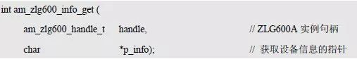 该函数意在获取ZLG600A 的基本信息,包括产品信息和版本信息等,获取的信息为字符串,比如,“ZLG600A V1.00”。其函数原型为: