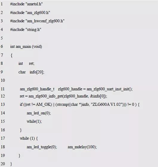 假定选择UART 通信方式,即可使用am_zlg600_uart_inst_init()实例初始化函数获取ZLG600A 的实例句柄。同时包含标准C 头文件string.h,便于使用strcmp()函数判断字符串是否为“ZLG600A V1.00”?
