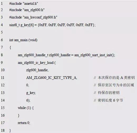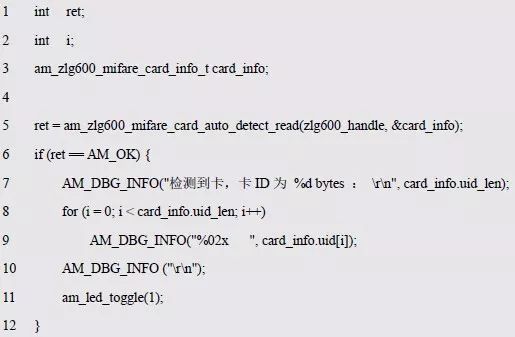 自动检测获取卡片信息card_info 详见程序清单6.101,调用am_zlg600_ic_key_load()将密钥存放在在0 区的E2PROM 中的程序详见程序清单6.103。
