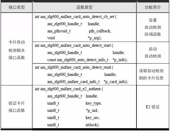 表6.26 Mifare S50/S70 接口函数(am_zlg600.h)