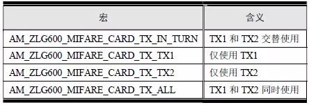 tx_mode 设置天线的工作模式,ZLG600A 有2 个天线TX1 和TX2,4 种工作模式:仅使用TX1、仅使用TX2、TX1 和TX2 交替使用、TX1 和TX2 同时使用,各种模式对应的tx_mode 的值宏定义详见表6.27。