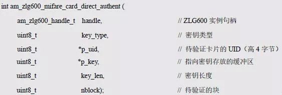 如果使用“直接验证”(AM_ZLG600_MIFARE_CARD_AUTH_DIRECT)的方式,则信息结构体的key[16]包含了实际的密钥,key_len 表示了密钥的长度。