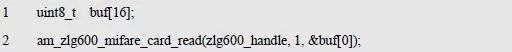 其中,nblock 指定读取的块号,p_buf 为指向存放数据的缓冲区,缓冲区大小为16 字节。返回值为AM_OK 时,表明读取数据成功,反之失败。如程序清单6.108 所示为读取块1 数据的范例程序。