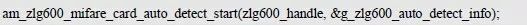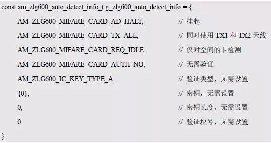 如果在自动检测到卡片时,不需要读取数据,则应该将auth_mode 的值设置为AM_ZLG600_MIFARE_CARD_AUTH_NO。由于不会用到信息结构体中key_type、key[16]、key_len、nblock 四个成员的值,因此无需设置。