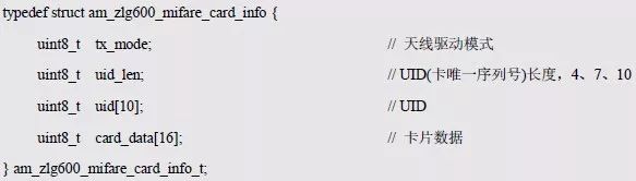 其中,p_card_info 为指向卡片信息的指针,用于获取卡片信息。卡片信息的类型am_zlg600_mifare_card_info_t(am_zlg600.h)定义如下: