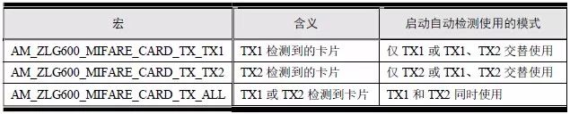 ad_mode 表示检测模式,用于配置检测相关动作。当检测到卡片时,是否挂起该卡片,若选择挂起,设置ad_mode 的值为AM_ZLG600_MIFARE_CARD_AD_HALT(am_zlg600.h),则在检测到一次该卡片后,就将该卡片挂起,后续检测将忽略该卡片。若需再次检测该卡片,必须将卡片远离ZLG600A 后重新靠近才有效。若设置ad_mode 的值为0,则不会挂起卡片,每次自动检测均可以检测到靠近的卡片。