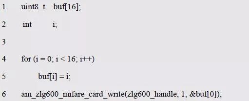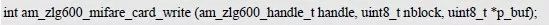 其中,nblock 指定写入的块号,p_buf 为指向写入数据的缓冲区,缓冲区大小为16 字节。返回值为AM_OK 时,说明写入数据成功,反之失败。如程序清单6.109 所示为写入16 字节数据至块1 的范例程序。