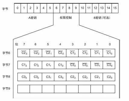 如需修改密钥和控制权限,重点在理解字节6、7 和8(字节9 是一个普通的数据)的含义。3 个字节共计24 位,每6 位(分别为C1、C2、C3、