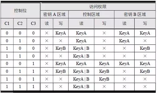 同样,表中“×”表示任何情况下都无权限,“KeyA”表示通过密钥A 验证后可以取得权限,KeyB 表示通过密钥B 验证后可以取得权限,“KeyA | B”表示通过密钥A 或者密钥B 验证后均可取得权限。