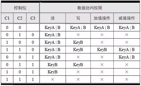 表中,“×”表示任何情况下都无权限,“KeyA”表示通过密钥A 验证后可以取得权限,KeyB 表示通过密钥B 验证后可以取得权限,“KeyA | B”表示通过密钥A 或者密钥B 验证后均可取得权限。由此可见,密钥A 的安全性很高,任何情况下都无法读出。特殊情况下,当C1C2C3 的值为000、010 或001 时,验证密钥A 后即可读取密钥B 区域的数据。
