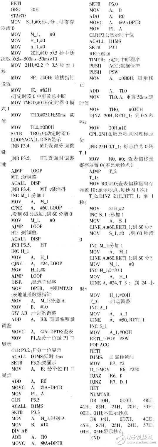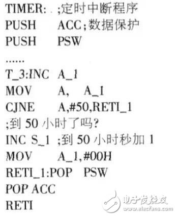 2.单片机电子时钟利用内部定时,计数器溢出产生中断(12MHz晶振一般为50ms)再乘以相应的倍率,来实现秒、分、时的转换。大家都知道,从定时,计数器产生中断请求到响应中断,需要3_8个机器周期。定时中断子程序中的数据人栈和重装定时,计数器的初值还需要占用数个机器周期。此外。从中断人口转到中断子程序也要占用一定的机器周期。例如: