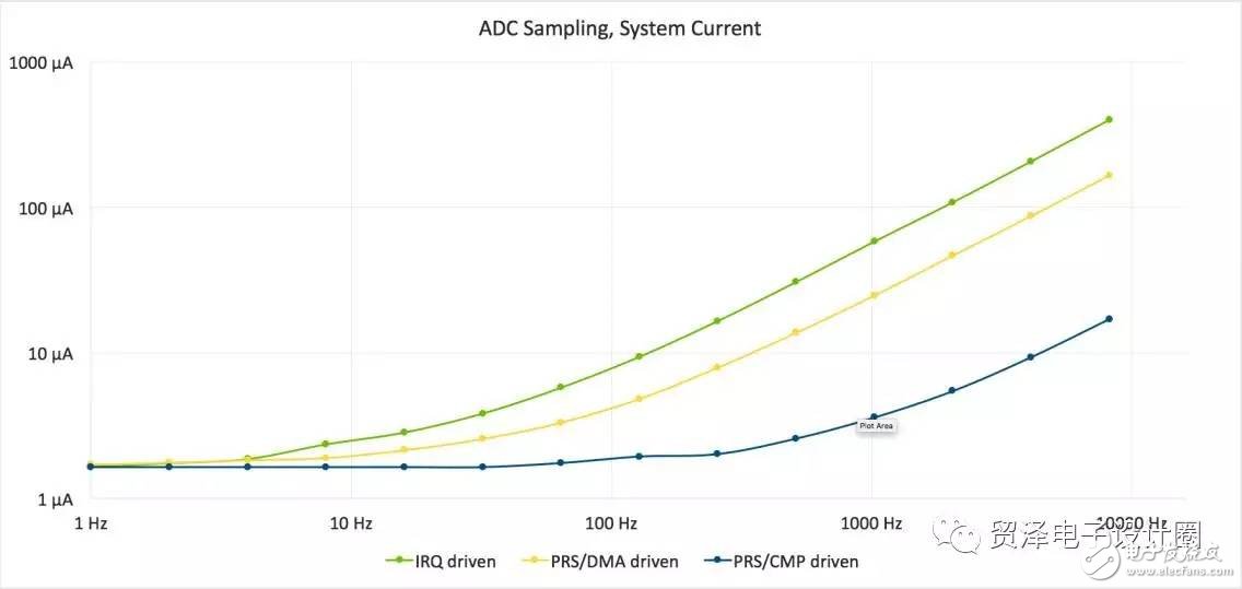 图1 采用中断进行ADC采样,显示出随着每秒采样次数的增加,功耗也在增加