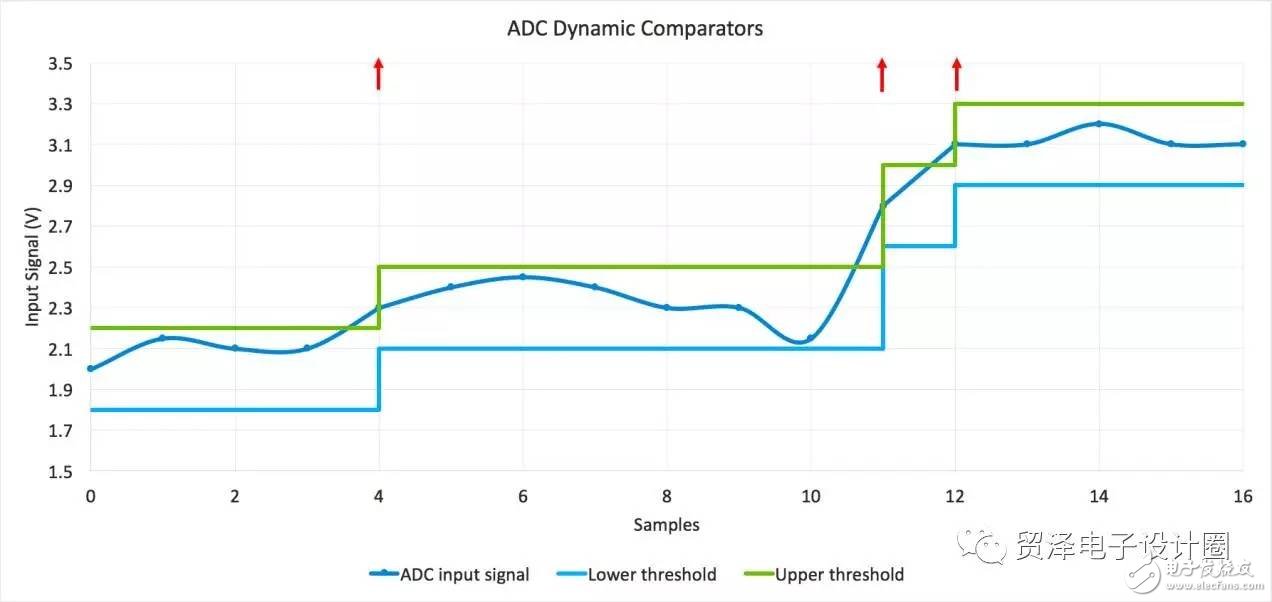 当使用比较功能监视信号时,一种方法是测量信号,然后根据这个信号设置阈值,只要信号在阈值范围内,那么当ADC测量信号时,系统可以保持在深度睡眠模式,当然CPU也保持在睡眠模式。