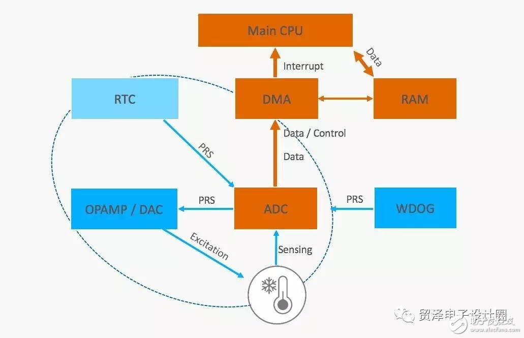 使用MCU或WMCU的最直接的方法是让CPU管理一切。例如,您可以启动模数转换(ADC),将一些数据放入通信接口(如USART传输)中,读取ADC数据,并对数据做出一些处理,所有一切都由CPU直接控制。直接的CPU控制简化了开发,但其成本是:每当外设或外部事件需要处理时,MCU都将处于工作模式,从而使功耗大增。