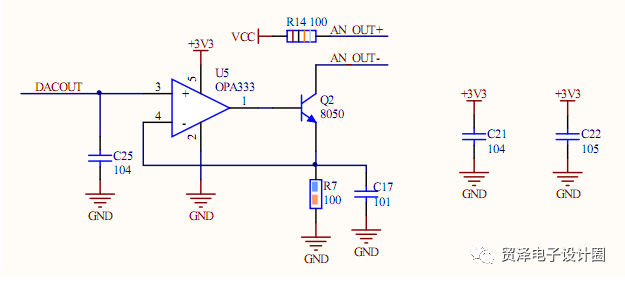 上图即为非常精确的转换电路,OPA333是一颗非常优异的单电源轨至轨运算放大器,其工作电压为2.7-5.5V,其失调电压仅为10uV,实测最低输出为30uV,最高输出可达VCC-30uV。电路组成压控恒流源,其关键在于OPA333这颗芯片的优异性能,使得以上电路获得了极高的精度和稳定性。DACOUT来自于STM32的DAC1或者DAC2输出,由C25进行数字噪场滤波之后进入运算,进行1:1缓冲,后经过Q2进行电流放大,在R7上形成检测电压,C17进行去抖动处理。4-20mA信号由AN_OUT+/AN_OUT-之间输出。