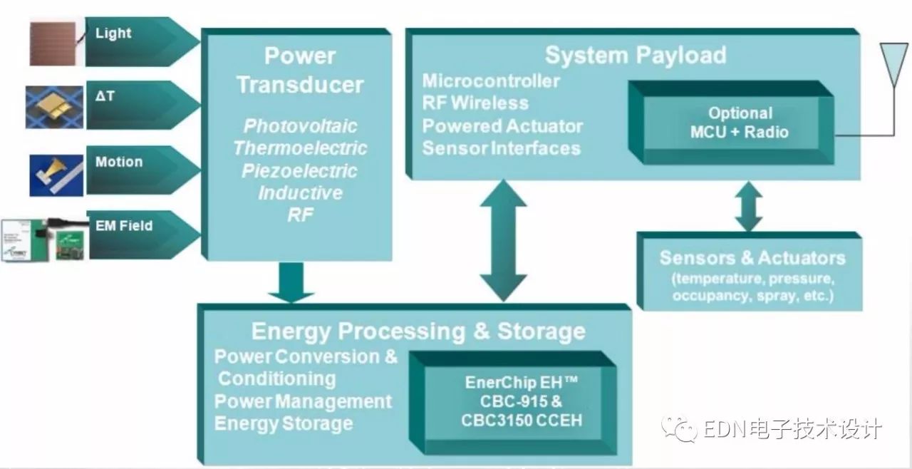 图2:零功耗传感器几乎能够从任何环境中收集能量。能源包括光、振动、流动、运动、压力、磁场和RF。(来源:Cymbet公司)