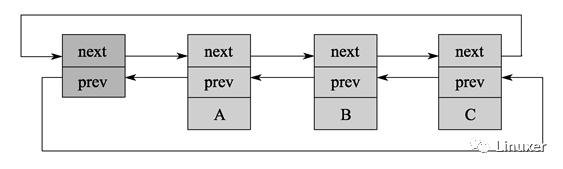 虽然理论上rcu_assign_pointer()和rcu_derederence()可以用于构造任何能想象到的受RCU保护的数据结构,但是实践中常常只用于构建更上层的原语。例如,将rcu_assign_pointer()和rcu_dereference()原语嵌入在Linux链表的RCU变体中。Linux有两种双链表的变体,循环链表struct list_head和哈希表structhlist_head/struct hlist_node。前一种如下图所示。