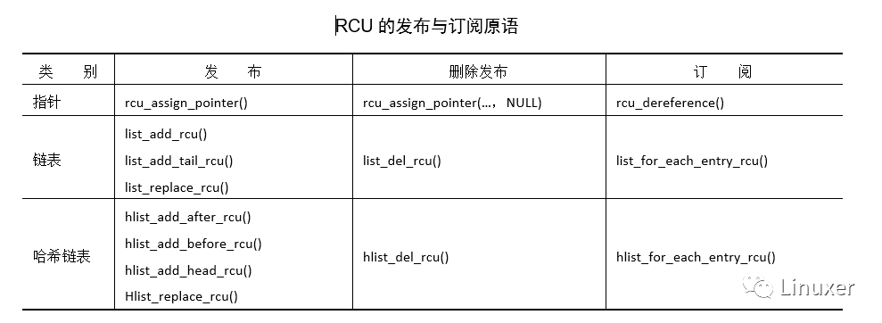 list_add_rcu()原语向指定的链表发布了一项条目,保证对应的list_for_each_ entry_rcu()可以订阅到同一项条目。