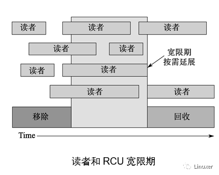 如上图所示,RCU是一种等待已有的RCU读端临界区执行完毕的方法,这里的执行完毕也包括在临界区里执行的内存操作。不过请注意,在某个宽限期开始后才启动的RCU读端临界区会扩展到该宽限期的结尾处。