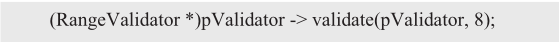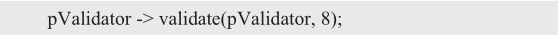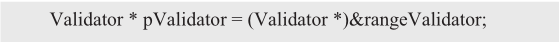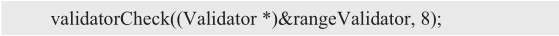 因此可以利用这一特性获取validateRange()函数的地址,即pValidator->validate指向validateRange()。其调用形式如下:
