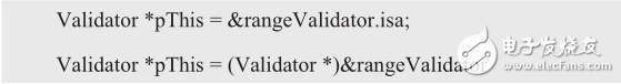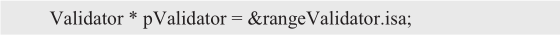 当将Validator类型的isa作为RangeValidator结构体成员时,显然rangeValidator.isa是一个结构体变量名,可以象任何普通结构体变量一样使用。使用Validator类型表达式: