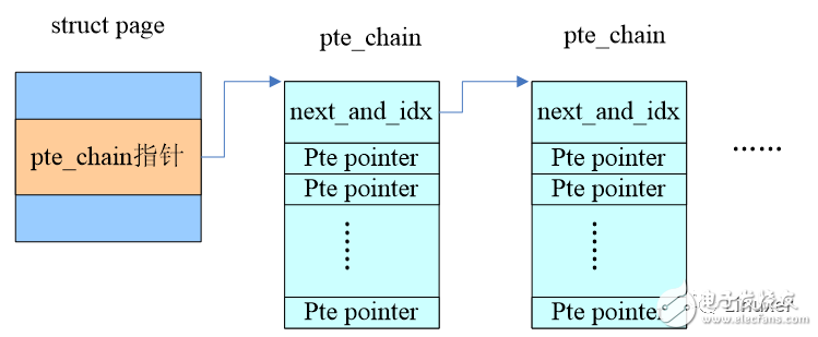 如何构建rmap?最直观的想法就是针对每一个page frame,我们维护一个链表,保存属于该page的所有PTEs。因此,Rik van Riel给struct page增加了一个pte chain的成员,以便把所有mapping到该page的pte entry指针给串起来。这样想要unmap一个page就易如反掌了,沿着这个pte chain就可以找到所有的mappings。一个基本的示意图如下,下面的小节会给出更详细的解释。