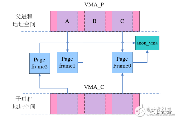这时候由于写操作,父子进程原本共享的page frame已经不再共享,然而,这两个page却仍然指向同一个anon_vma,不仅如此,对于B这样的页面,一开始就没有在父子进程之间共享,当首次访问的时候(无论是父进程还是子进程),通过do_anonymous_page函数分配的page frame也是同样的指向一个anon_vma。也就是说,父子进程的VMA共享一个anon_vma。