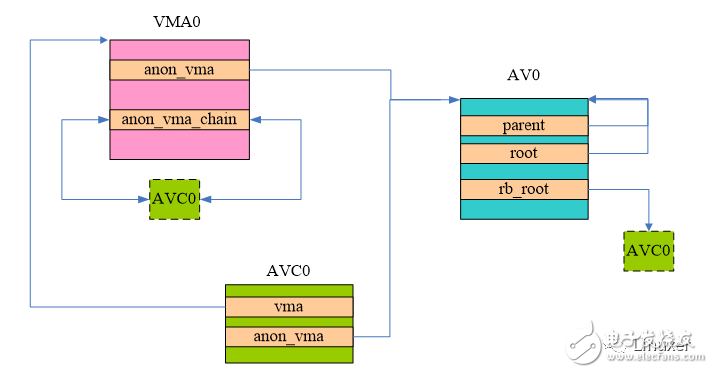 上图中的AV0就是该进程的anon_vma,由于它是一个顶级结构,因此它的root和parent都是指向了自己。AV这个数据结构当然为了管理VMA了,不过新机制中,这是通过AVC进行中转的。上图中的AVC0搭建了该进程VMA和AV之间的桥梁,分别有指针指向了VMA0和AV0,此外,AVC0插入到AV的红黑树,同时也会插入到VMA的链表中。