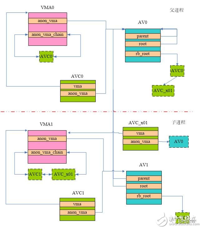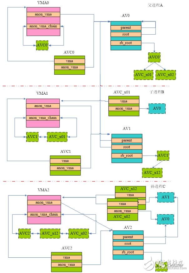父进程也会创建其他新的子进程,新创建的子进程的层次和VMA1、VA1的类似,这里就不描述了。不过需要注意的是:父进程每创建一个子进程,AV0的红黑树中会增加每一个起“桥梁”作用的AVC,以此连接到子进程的VMA。