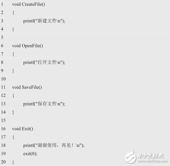 下面将以控制台菜单选项为例,介绍多分支选择结构程序设计的思想与实现方法。一般来说,菜单栏至少包括新建文件、打开文件、保存文件和退出4项基本功能。比如: