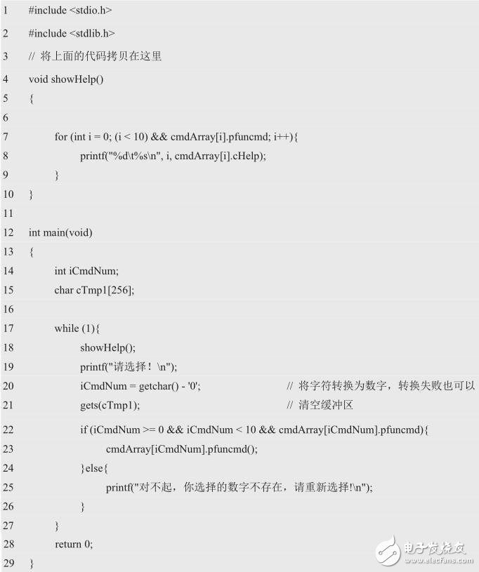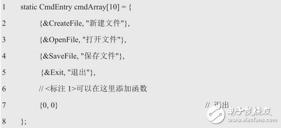 接着定义一个结构体数组作为函数表,分别用于存储菜单函数的入口地址和菜单信息。其声明如下: