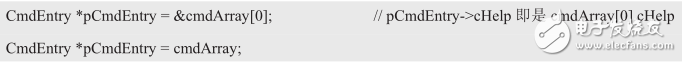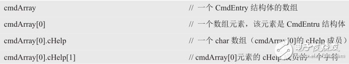 在这里,将cmdArray声明为一个内含10个元素的数组,数组的每个元素都是一个CmdEntry类型的数组,因此cmdArray[0]是第一个CmdEntry类型的结构体变量,cmdArray[1]是第2个CmdEntry类型的结构体变量,以此类推。cmyArray是数组名,该数组中的每个元素都是CmdEntry类型的结构体变量。