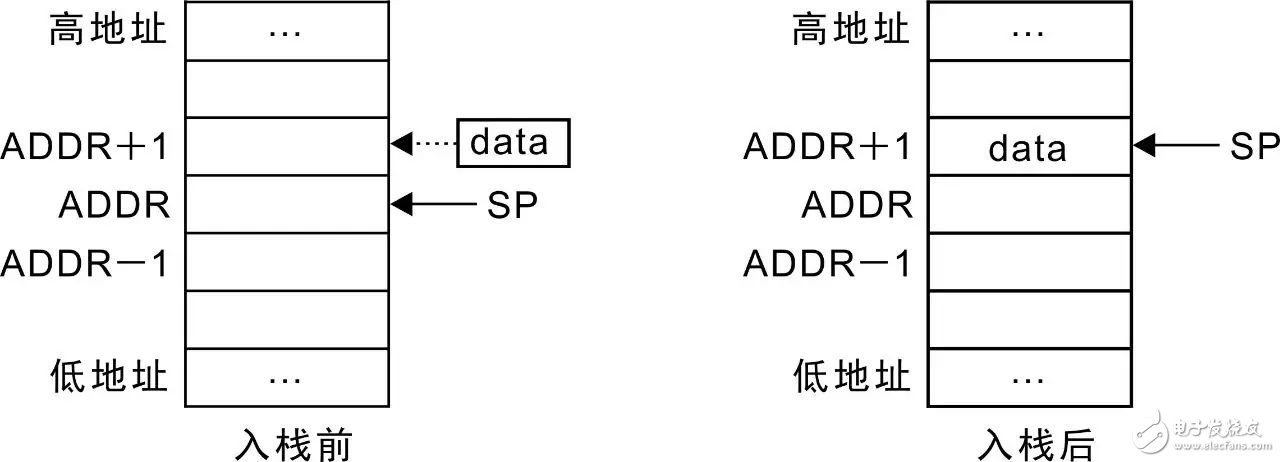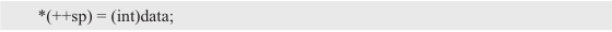 如果将sp当作(int *)类型的变量,则对于满递增堆栈来说,将数据data入栈用C语言描述如下(详见图2.8):
