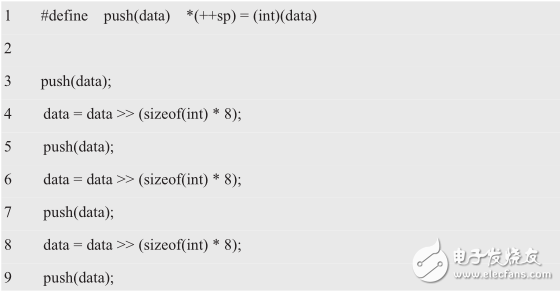 如果data的长度大于sizeof(int),则需要将数据拆分后多次入栈,入栈的顺序可以先低位后高位,也可以反过来。如果入栈的顺序为先低位后高位,其示例详见程序清单 2.27。