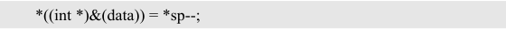 假设允许入栈和出栈数据为int,即sp为(int *)类型变量。如果入栈的数据小于sizeof(int)个字节,则需要将其转换成int类型数据才能入栈,且出栈后也要进行相应的类型转换。对于入栈的数据大于sizeof(int)个字节,则只能拆分数据,一次入栈数据的一部分,通过多次入栈完成整个数据的入栈;而出栈这个数据也要多次,全部出栈后再组合成原始数据。