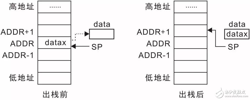 如果将sp当作(int *)类型的变量,则对于满递增堆栈来说,将数据出栈用C语言描述如下(假设出栈的数据保存到变量data中,详见图2.9):