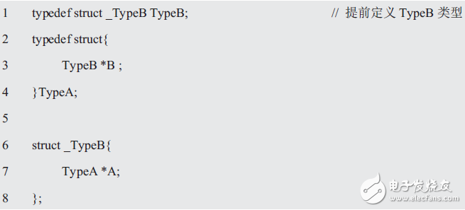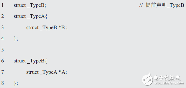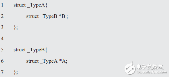 此时,struct _TypeA和struct _TypeB是互相引用的,虽然无论先声明哪一边都很麻烦,但可以先通过声明结构体标记回避以上问题。比如:
