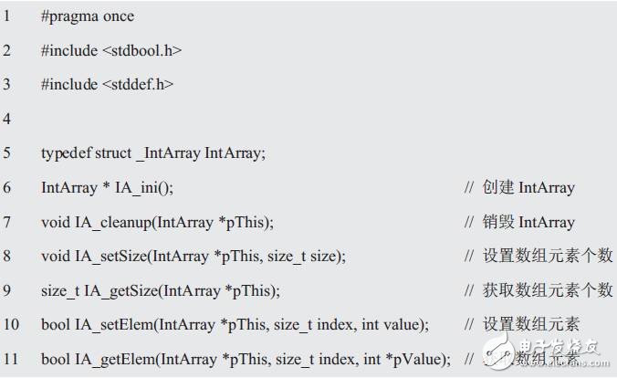 为了说明这些函数构成了IntArray对象的接口,并防止函数名和其它对象的接口冲突,于是在每个函数名前使用了前缀IA_,且每个函数都有一个IntArray*型的对象作为参数,这个参数就是函数将要操作的对象。
