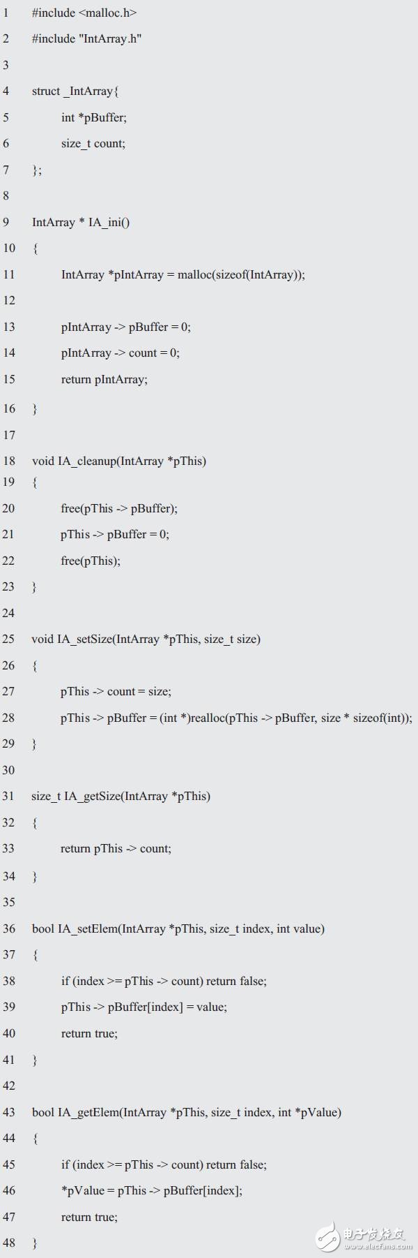 其中,IA_setSize()用于改变数组大小,首先释放原有的元素,然后保存新的元素,且为新元素分配存储空间。当然,也可以优化进一步代码,比如,只有数组大小增加时才重新分配空间。IA_getSize()访问给定下标所指的元素,让IntArray检查下标是否在界内。