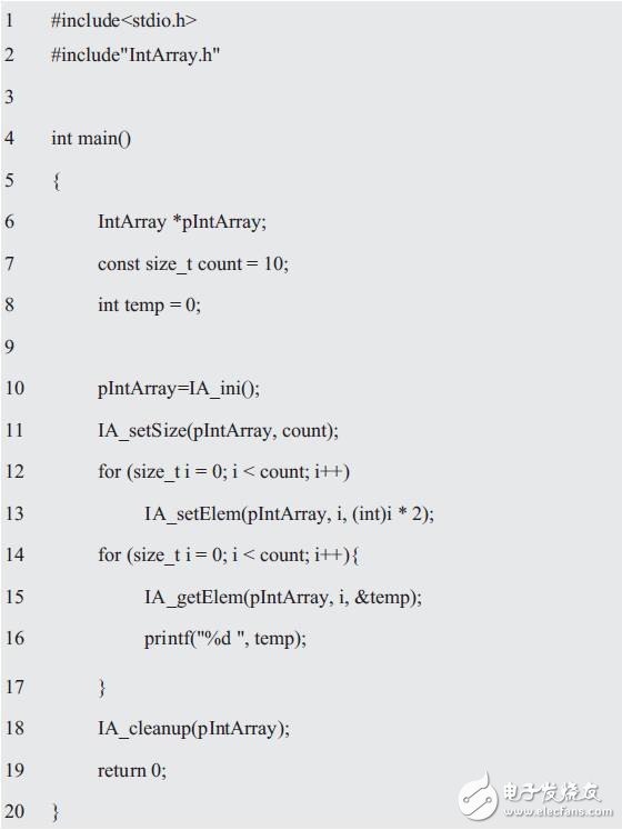 由此可见,IntArray的实现是由两部分组成的,即保存对象信息的数据和构成对象接口的函数,其使用范例程序详见程序清单 2.32。
