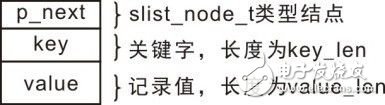 12 }程序分配了一个结点的空间,该结点的空间需要存储一个slist_node_t类型链表结点,便于添加结点到链表中,存储长度为p_hash->key_len的关键字,存储长度为p_hash->value_len的记录值,详见图3.26,其内存的大小为: