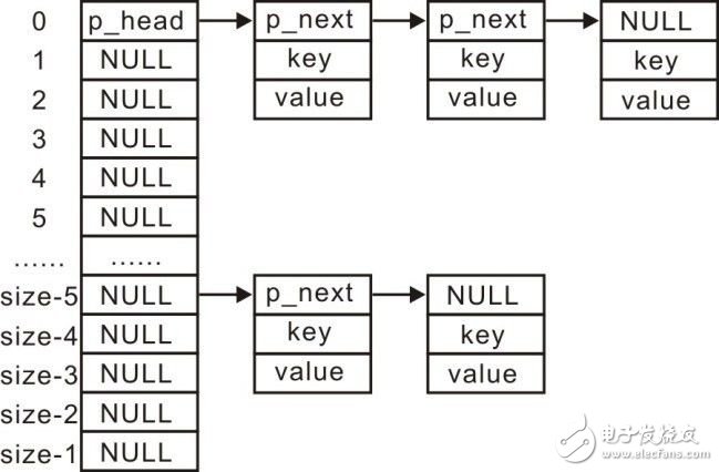 与图3.25中管理学生记录的链式哈希表结构示意图对比发现,它们表达的含义是完全一致的,仅仅是具体类型变为了更加通用的void *类型。