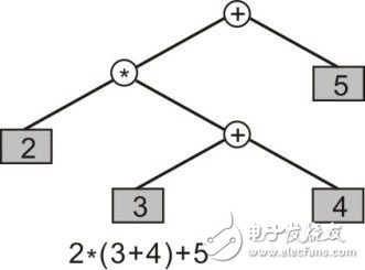 求解算术表达式就是一种二叉树,它的结点包含两种类型的对象:操作符和终值。操作符是拥有操作数的对象,终值是没有操作数的对象。表达式树背后的思想——存储在父结点中的是操作符,其操作数是由子结点延伸的子树组成的。操作数有可能是终值,或它们本身也可能是其它的表达式。表达式在子树中展开,终值驻留在叶子结点中,这种组织形式的好处是可以通过表达式将一个表达式转换为3种常见的表示形式:前缀、中缀和后缀,但中缀表达式是在数学中学到的最为熟悉的表达方式。在这里,将以2*(3+4)+5中缀表达式算术树结构为例。