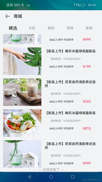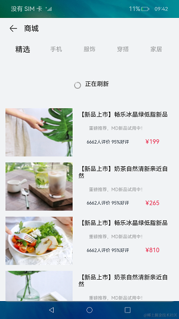 OpenHarmony ArkTS提供了丰富的接口和组件,开发者可以根据实际场景和开发需求,选用不同的组件和接口。在本篇Codelab中,我们使用Scroll、List以及LazyForEach实现一个商品列表的页面,并且拥有下拉刷新,懒加载和到底提示的效果。效果图如下: