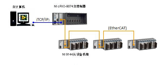 EtherCAT在标准的以太网电缆上应用主/从式的构架。美国国家仪器公司的EtherCAT主设备由带有两个以太网端口的实时控制器构成,如NI CompactRIO及PXI。每个NI从设备同样包含两个端口,允许以菊花链模式与主控制器连接。