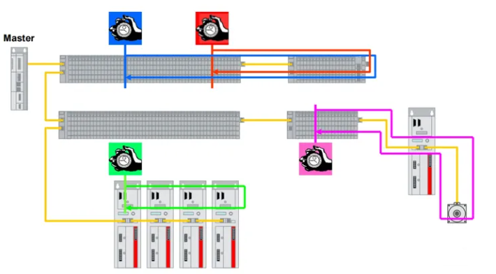 EtherCAT主站会挑选第一个带时钟(DC)功能的从站作为时钟主站(DC Master),各从站按照时钟主站的时间统一步调。这样,如果多个电机做多轴插补的时候,就可以参考精准的时钟信号统一时间采样(采集命令数据),统一时间动作,就像这样: