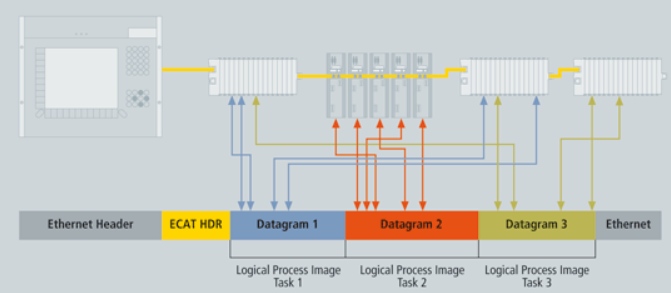 EtherCAT技术突破了其他以太网解决方案的系统限制:通过该项技术,无需接收以太网数据包,将其解码,之后再将过程数据复制到各个设备。EtherCAT从站设备在报文经过其节点时读取相应的编址数据,同样,输入数据也是在报文经过时插入至报文中(参见图1)。整个过程中,报文只有几纳秒的时间延迟。