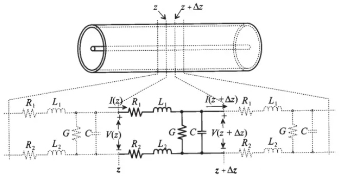 对于传输线,通常的研究方法是,对其中某一个小段进行微观的研究。用微积分的思想取其中一小段,这一小段有分布电阻,分布电感,分布电导,分布电容。