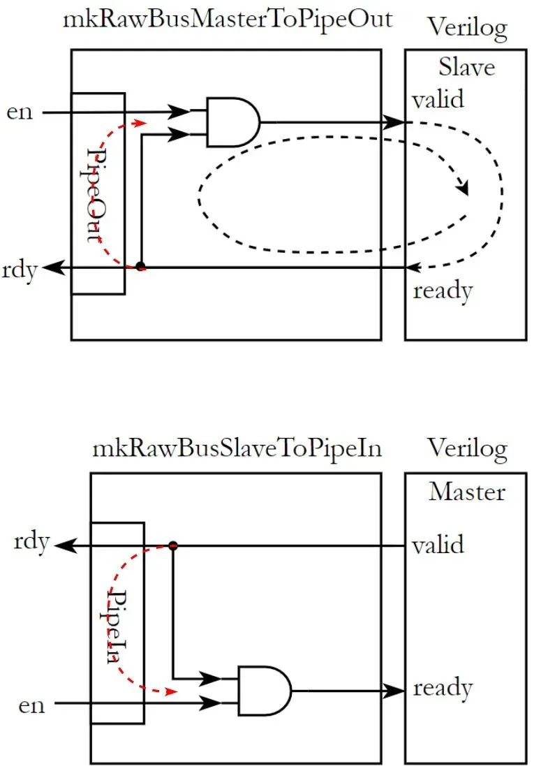 从实现功能的角度上看,PipeOut/PipeIn和Get/Put接口类似,都可分别实现数据的输出/输入。但对于Get/Put接口,其get/put方法所隐含的en-rdy控制信号在BSV中是无法访问的。而对于PipeOut/PipeIn接口,其将deq/enq方法对应的rdy信号分别通过notEmpty/notFull方法暴露出来,使得我们可以直接在BSV中对其进行访问,而这一点将极大地方便握手控制信号的转换。