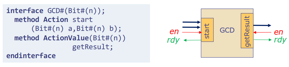 由于接口控制信号上的差异,要实现Bluespec SystemVerilog(BSV)生成的代码和外部Verilog代码之间的正确交互是一件比较麻烦同时容易出错的事情。在BSV中, 模块之间的交互都是基于Action或ActionValue这两类method完成。下图展示了使用BSV设计的某一模块的接口定义及其实际生成的硬件端口。由图可见,除了被显式地定义为函数输入参数或返回类型的数据信号外,每个method都隐含着一对控制信号,即en和rdy。